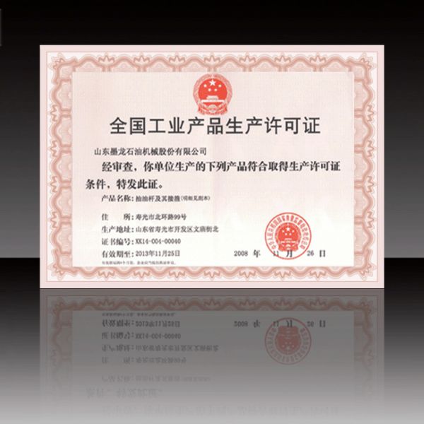 产品名称: 全国工业产品生产许可证(抽油杆及接箍) |